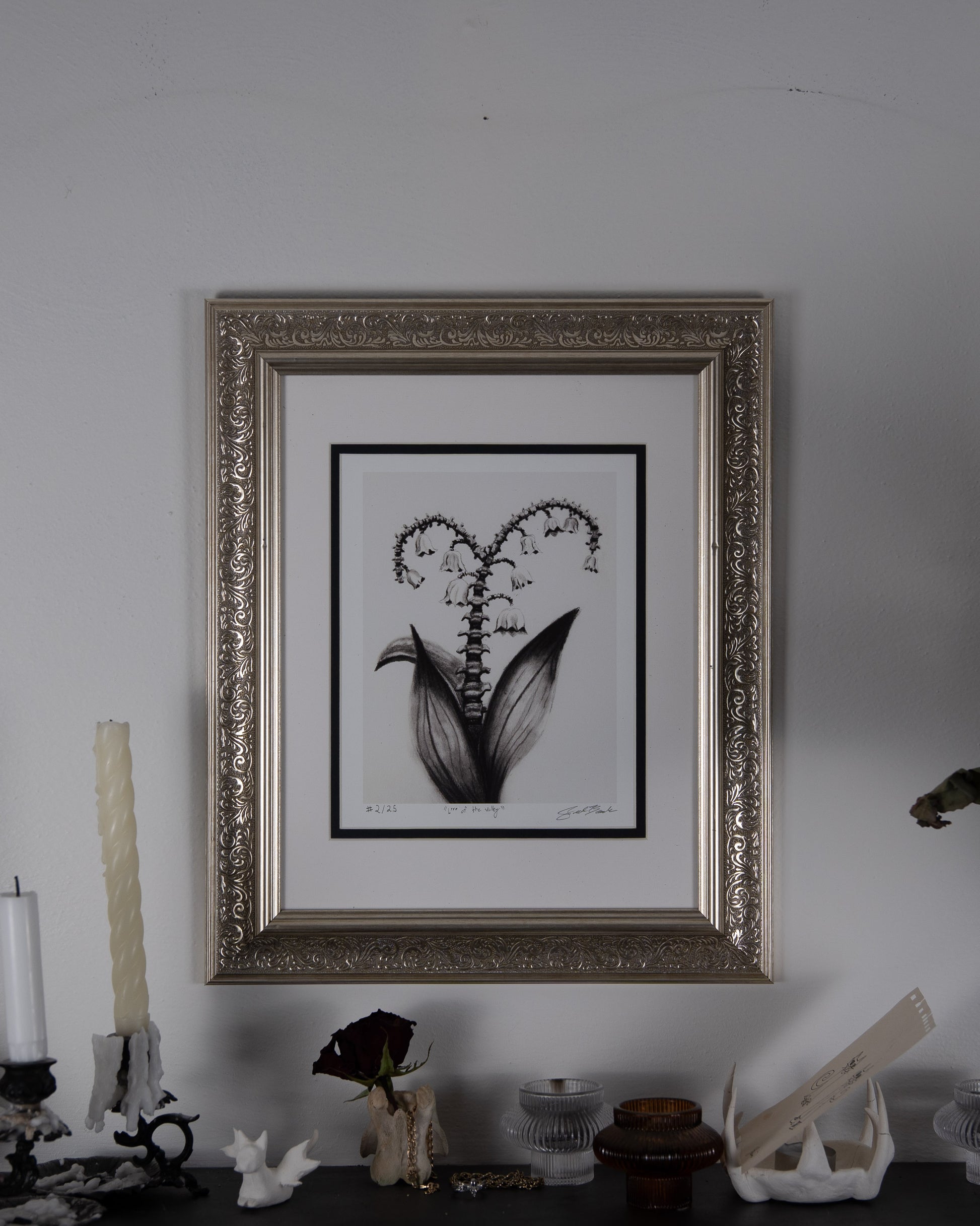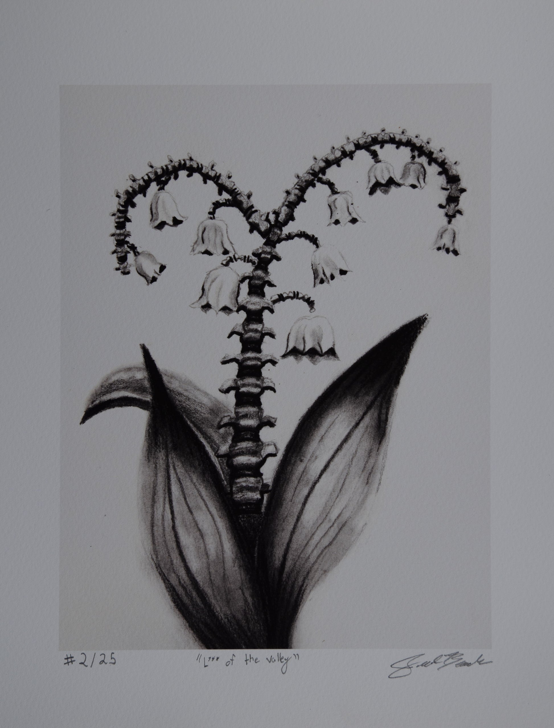 Originally created as a mixed media charcoal and graphite drawing, the piece combines anatomy and nature, balancing the strength of bone and the delicacy of nature.