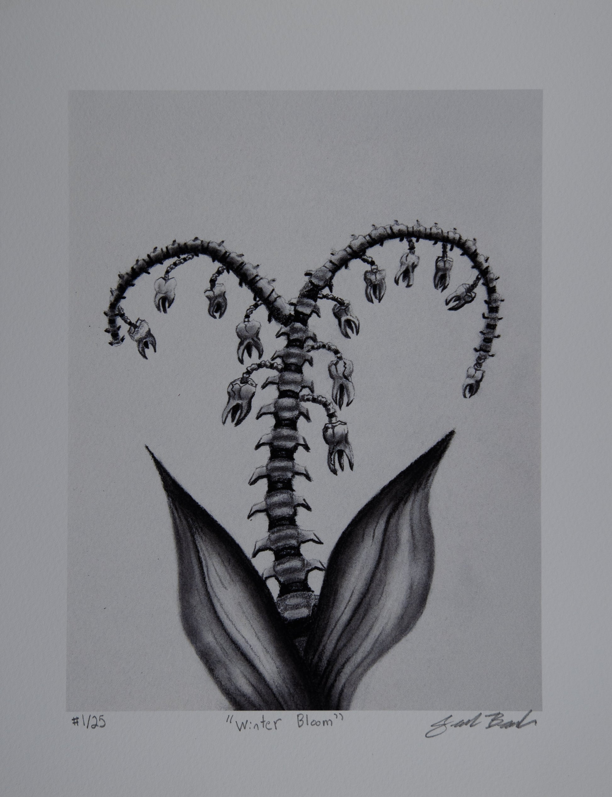 Originally created as a mixed media charcoal and graphite drawing, the piece combines anatomy and nature, balancing the strength of bone and the delicacy of nature.